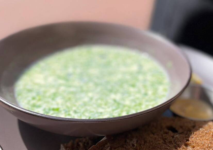 Окрошка з куркою, заправлена мінеральною водою з соком лимону та гірчицею.