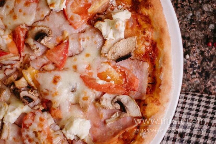 Класичне тісто, соус томатний з прованськими травами, сир моцарела, томати, печериці, крем-сир, бекон та шинка.