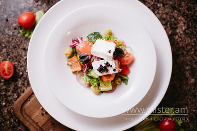 Салат зі свіжими овочами, міксом салату, ніжним сиром фета, заправлений оливковою олією , насінням та ароматними травами.