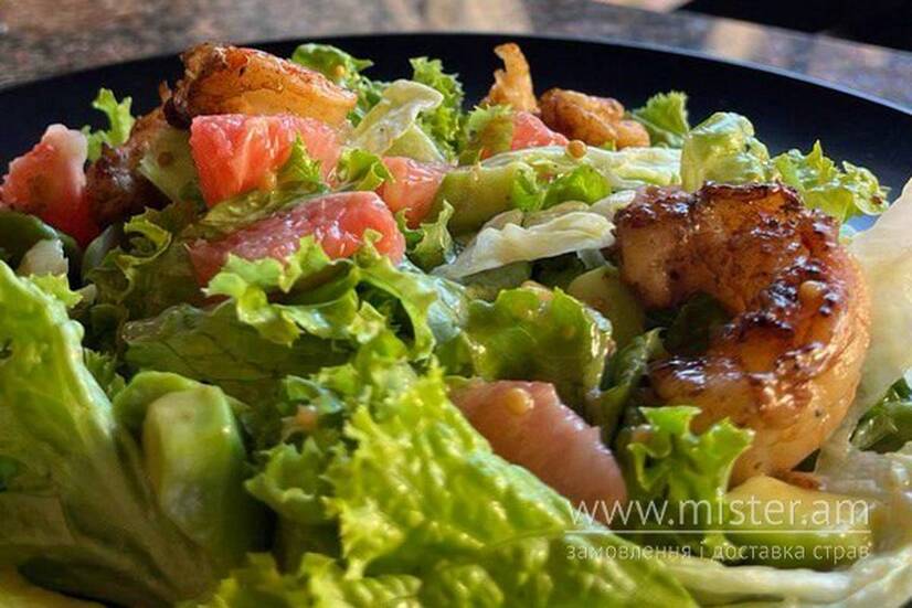 Обсмажені на вершковому маслі з додаванням часнику креветки, авокадо, грейпфрут, мікс салатів, соус на основі французької гірчиці та фрешу лимона.