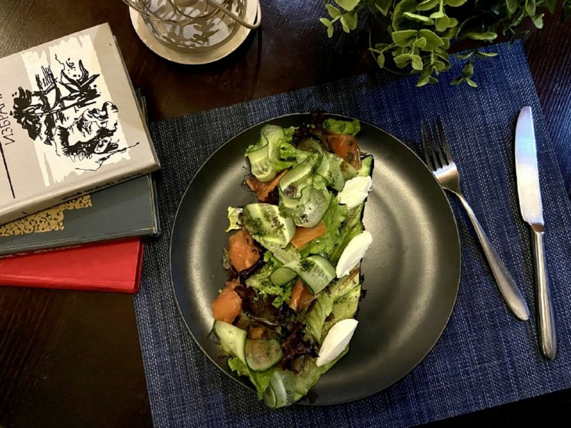 Салат із лососем слабої солі, свіжим огірком, грильованим кабачком, крем сиром та листям салату.