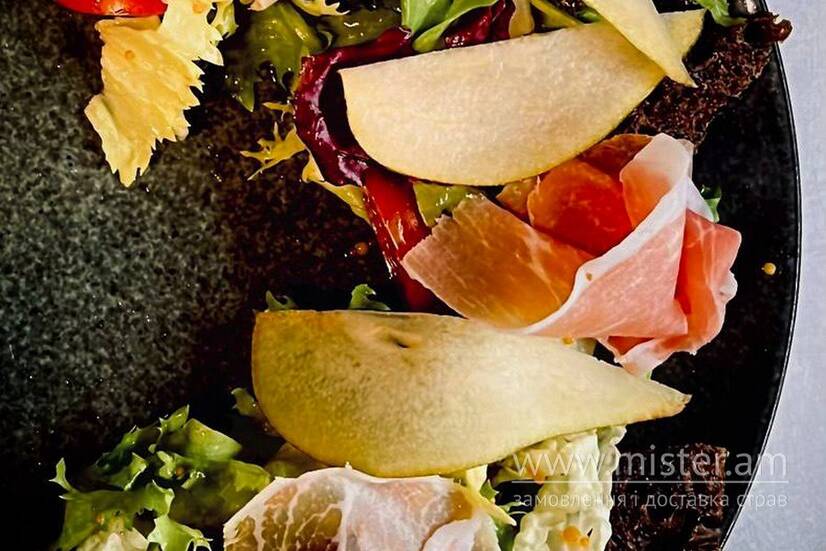 Мікс салатів з прошуто, грушею, в`яленими томатами, крутонами солодового хлібу та особливою кисло-солодкою заправкою.