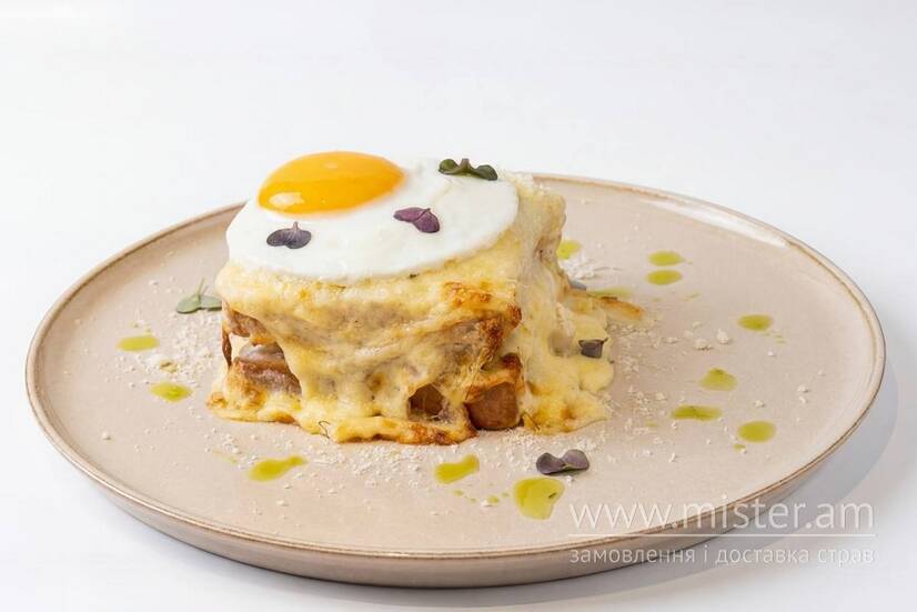 Яйце, хліб тостовий, гірчиця, соус бешамель, сир пармезан, сир сулугуні, сир голандський, куряче філе, бекон, зелена олія.