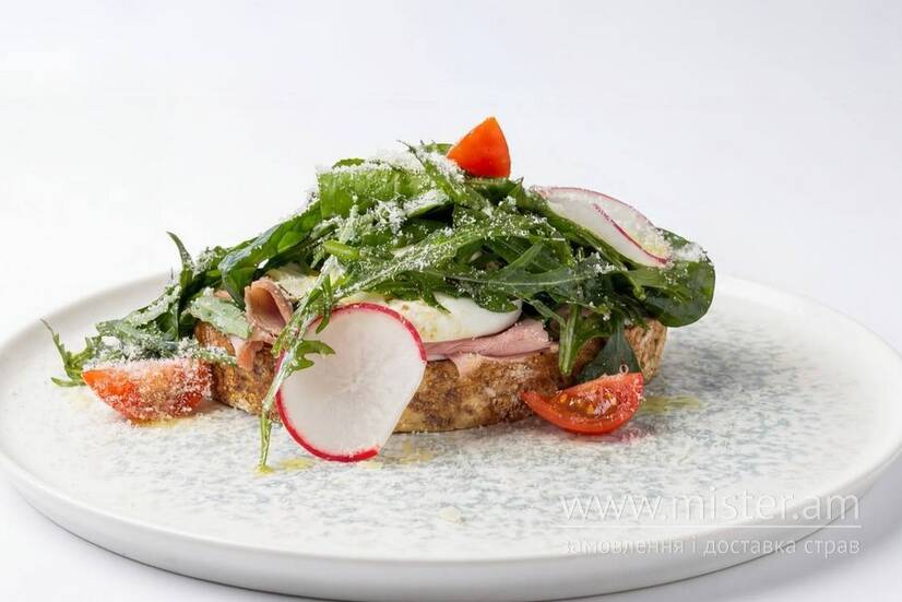 Яйце, булка зернова, мус з крем-сира, роздбіф, руккола, шпинат бейбі, соус вінігред, черрі, редиска, сир пармезан, олія трюфельна.