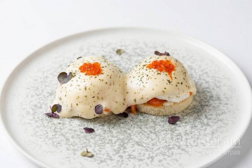 Яйце, хліб тостовий, мус з крем-сира, лосось с/с, соус бешамель, ікра лосося.