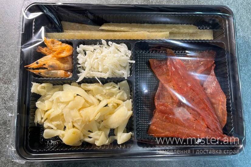 Снеки м`ясні та рибні : Ікра судака в`ялена, Стружка кальмара, Перуанський кальмар, Вугор сушений, Жовтий смугастик, Лакедра сушена, Тунець преміум, Кільця кальмара , Ікряник з лосося, Креветки сушені, Мідії сушені, Качка з вишнею, Свинина у вишневому соусі, Свинина класична, Янтарна з перцем