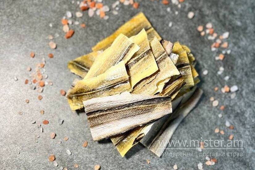 Снеки м`ясні та рибні : Сет асорті, Ікра судака в`ялена, Стружка кальмара, Перуанський кальмар, Жовтий смугастик, Лакедра сушена, Тунець преміум, Кільця кальмара , Ікряник з лосося, Креветки сушені, Мідії сушені, Качка з вишнею, Свинина у вишневому соусі, Свинина класична, Янтарна з перцем
