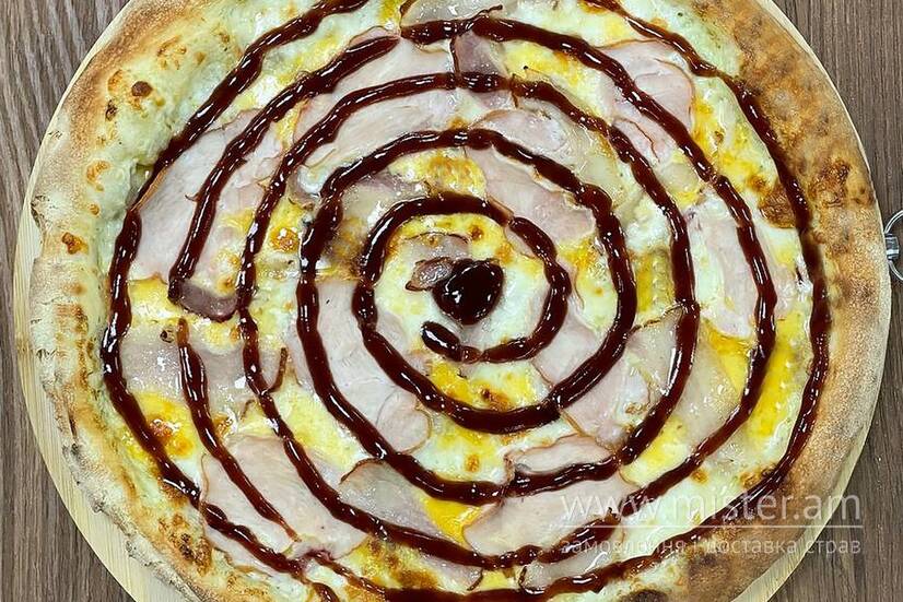 Соус часниковий, моцарела, бекон, курка запечена, соус барбекю, чедер.