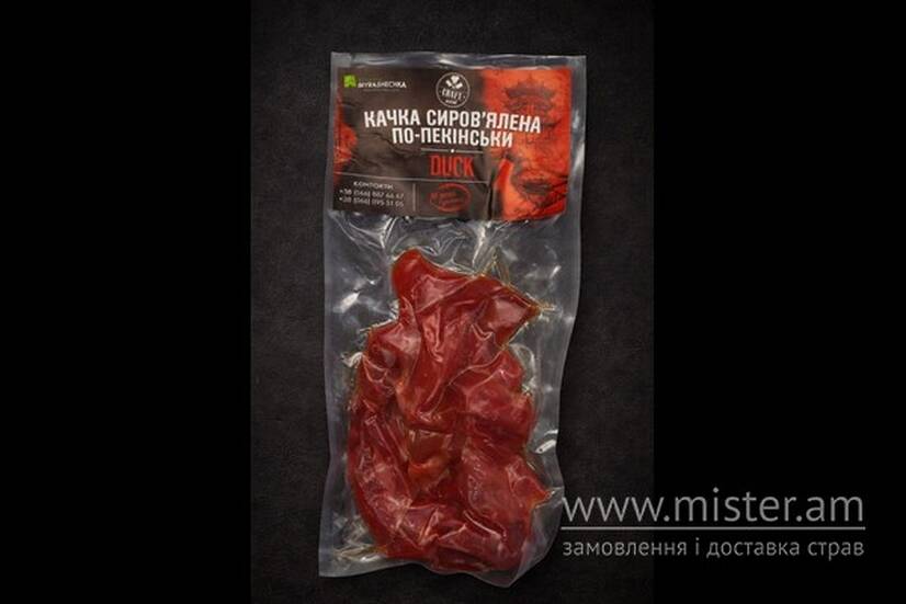 Сиров`ялені м`ясні снеки, виготовлені з натурального м'яса качки. Пікантний, насичений качиний смак, досягається завдяки поєднанню натуральних спецій та соєвого соусу. Дбайливо висушені шматочки м'яса, що зберігають текстуру. Ідеально підходить як снек до пива, перекус або додаток до азіатських страв.