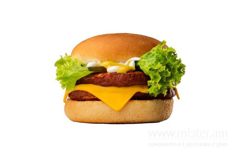 Пшенична булочка, 2 курячі котлети, лист салату, маринований огірок, сир чедер, соус часниковий, гірчиця.