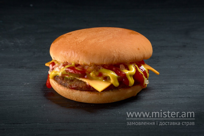 Відбірна високоякісна м'ясна котлета із запашною булочкою, в поєднанні з скибочкою сиру Чеддер, соковитою цибулею та хрустким маринованим огірком, приправлені кетчупом та американською гірчицею.