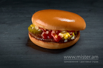 Відбірна високоякісна м'ясна котлета із запашною булочкою, в поєднанні з соковитою цибулею та хрустким маринованим огірком, приправлені кетчупом та американською гірчицею