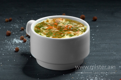 Зварений по класичному рецепту курячий бульйон, до якого додано свіжо зварену домашню локшину, моркву, рублені шматочки курятини та свіжий кріп