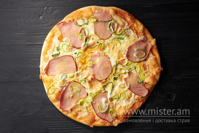 Основа, цибуля порей, сир моцарелла, бекон, яйце, соус томатний або вершковий.
