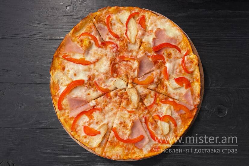 Основа, бекон, болгарський перець, куряче філе, сир, томатний або вершковий соус на вибір.