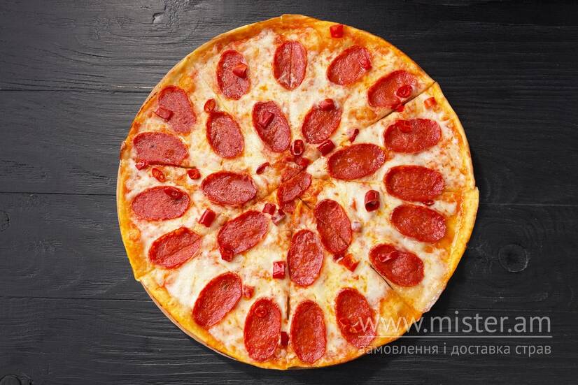 Основа, папероні, маринований перець чілі, сир, томатний або вершковий соус на вибір.