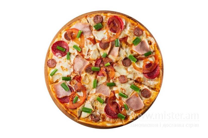 Піца на томатному або вершковому соусі з сиром моцарела, в поєднанні з беконом, салямі, курячим філе та баварськими ковбасками. Прикрашається зеленою цибулею та сухим часником.