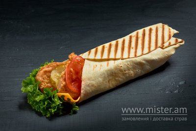 Це тонка, випечена по-домашньому тартілья, у яку загорнуте засмажене у хрусткій паніровці ніжне куряче філе, в поєднанні з скибочкою сиру Чеддер, соковитим салатом, кружальцями свіжого томату та маринованого огірка, заправлена ніжним майонезом, французським соусом або олією на вибір.