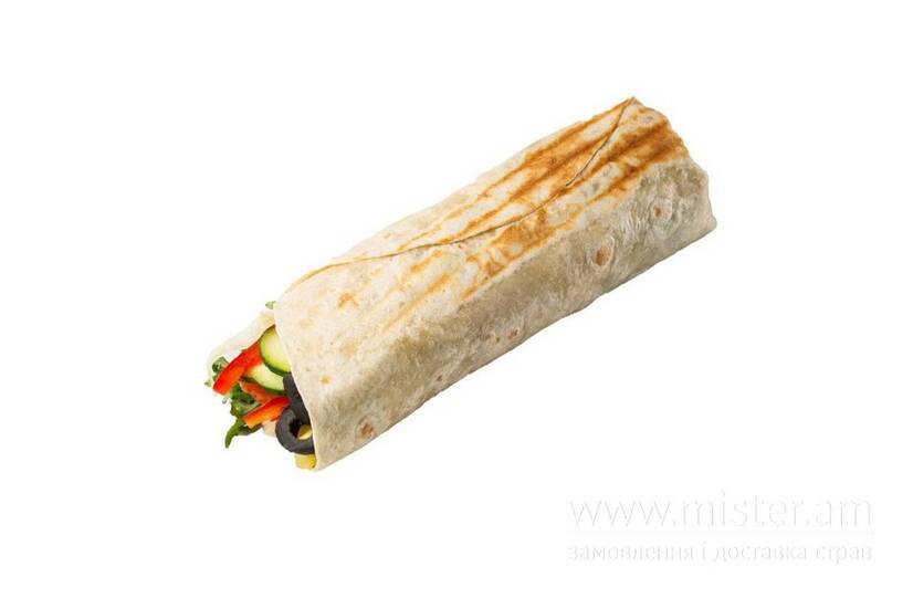 Лаваш, салат айсберг, огірок, томати, болгарський перець, маслини, сир фета, заправлена ніжним майонезом, французським соусом або олією на вибір.