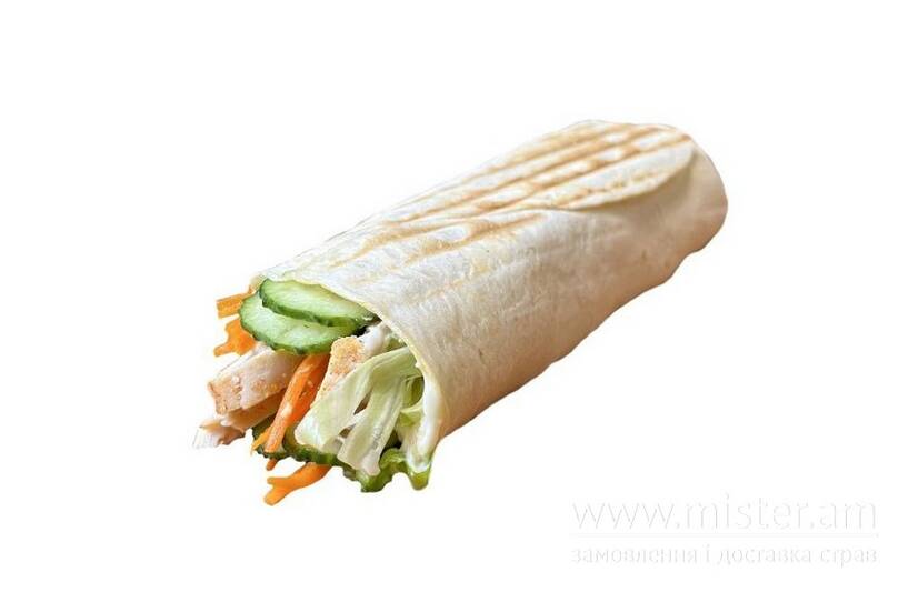 Це тонка випечена по-домашньому тартилья, у яку загортнуті шматочки курячого філе в поєднанні з морквою по-корейськи, айсбергом та свіжим огірком заправлена ніжним майонезом, французським соусом або олією на вибір.