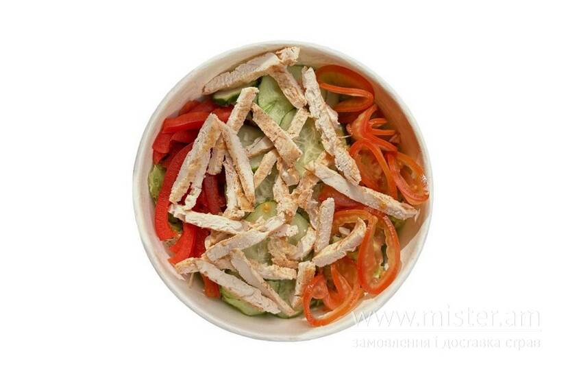 Свіжі помідори, огірок, болгарський перець, та листя салату гармонійно поєднуються з підсмаженим хрустким курячим філе