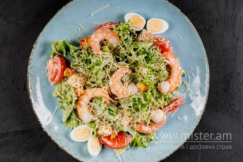 Мікс салату, соус цезар, креветки, крутони, сир пармезан, помідори, яйця перепелині.