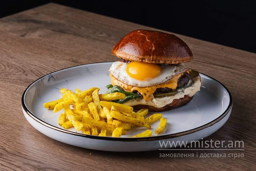 Булочка бріош, соус Айолі, огірок маринований, яйце смажене, соус барбекю, базилік, бекон, котлета з яловичини. Подається з сирною картоплею фрі.