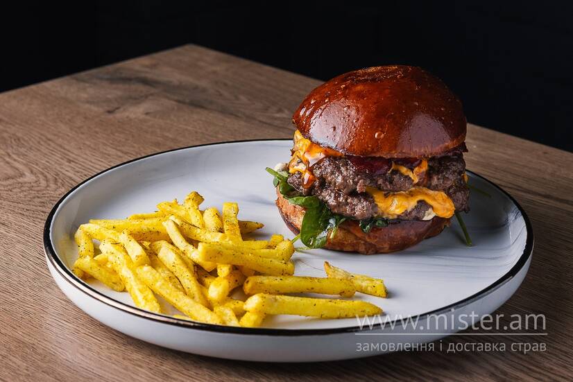 Булочка бріош, соус Айолі, сир чеддер, шпинат, соус сололкий Чилі, подвійна котлета з яловичини, бекон. Подається з сирною картоплею фрі.