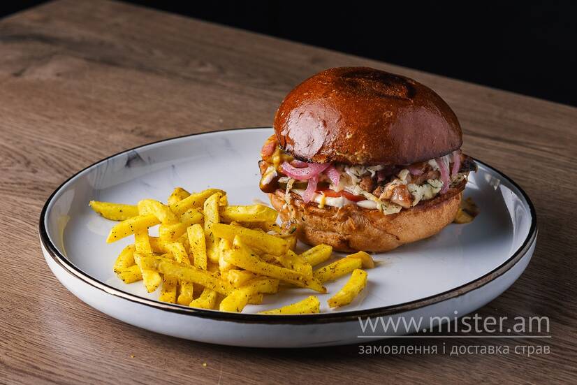 Булочка бріош, соус Айолі, соус Барбекю, гірчиця американська, сир Сулугуні, цибуля маринована, огірок маринований, томат, бекон, філе стегна куряче. Подається з сирною картоплею фрі.