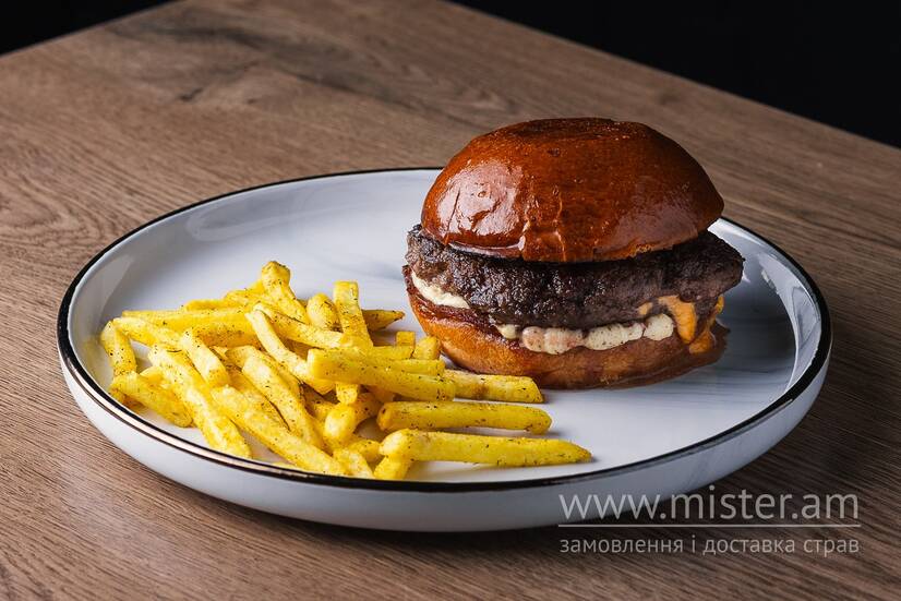 Булочка бріош, соус Айолі, сир Чеддер, сир Моцарела (всередині котлети), вишневий конфітюр, котлета з яловичини. Подається з сирною картоплею фрі.