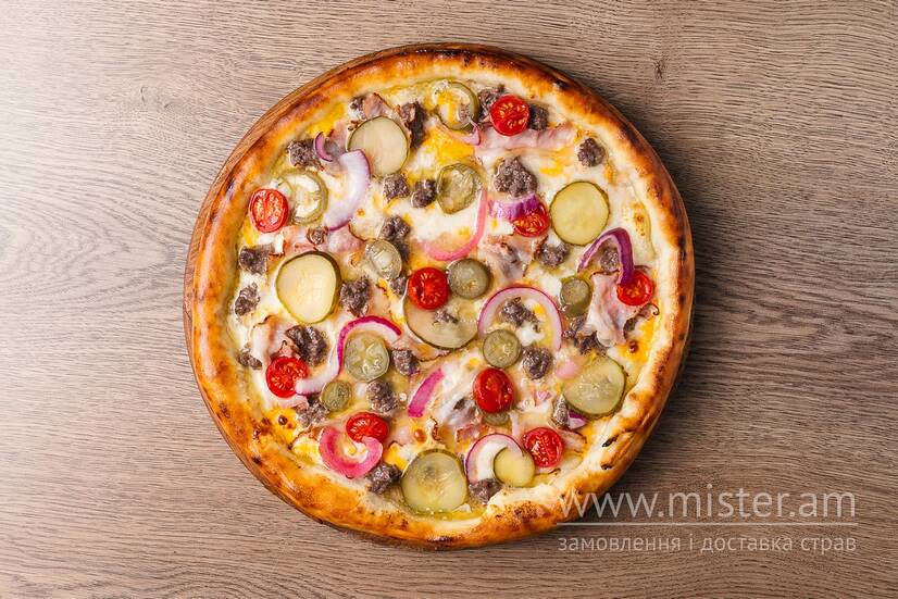 Соус Айолі, сир Моцарела, сир чедер, фарш яловичий, бекон, огірок маринований, перець халапеньо, маринована цибуля, томати.