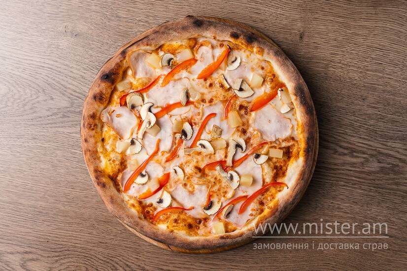 Соус Пілаті, ананас, філе куряче копчене, паприка, печериці.