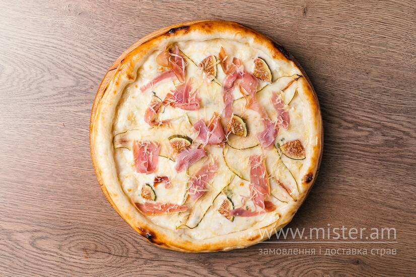 Соус Вершковий, сир Моцарела, груша, інжир, сир Дорблю, прошуто крудо.