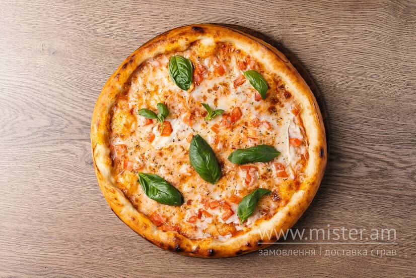 Соус Пілаті, сир Моцарела, свіжі томати, базилік, сир Пармезан, оливкова олія.