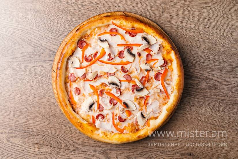 Соус Пілаті, сир Моцарела, мисливські ковбаски, печериці, паприка.