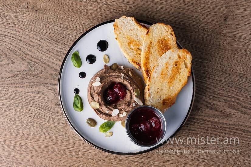 Ніжний паштет з курячої печінки, з додаванням яблук та овочів. Приготований су-від. Подається з підсмаженим багетом та вишневим конфітюром.
