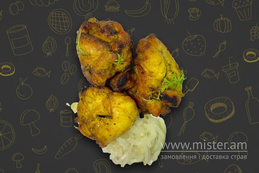 Шашлик з соковитого філе курячого стегна приготованого на мангалі, з маринованою цибулею.