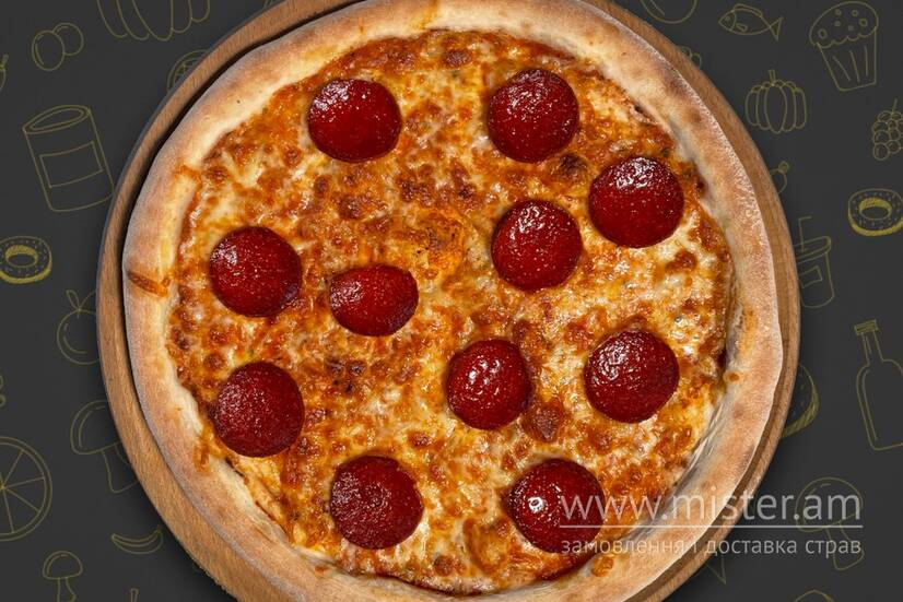 Тісто з італійського борошна, соус томатний, моцарела, пепероні.