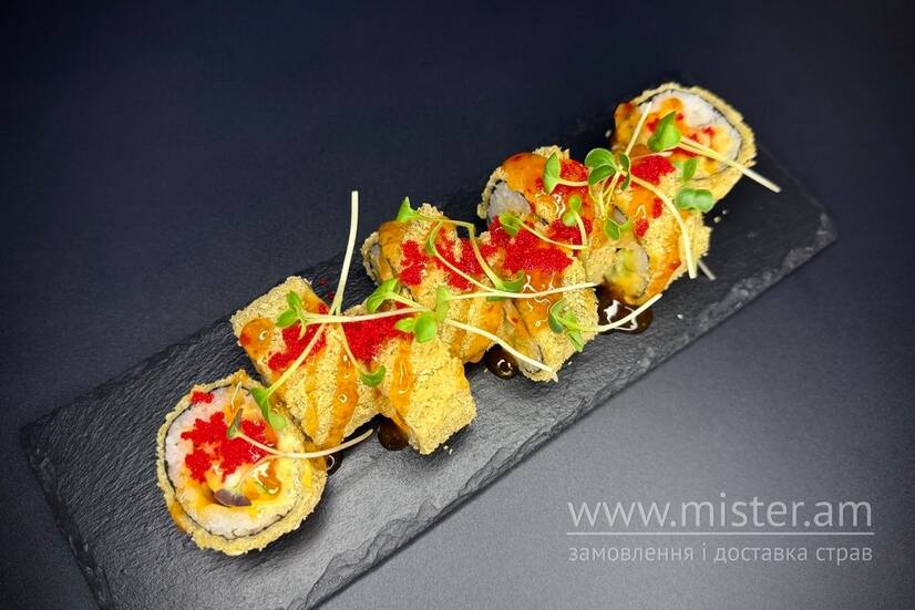 Рис, норі, сир чеддер, соус спайсі, огірок, креветка тигрова. До ролів додаються палички, соєвий соус, імбир та васабі. З детальною інформацією про продукцію та вміст алергенів у конкретних стравах можна дізнатися за номером телефону закладу або за посиланням https://usnd.to/JOxl