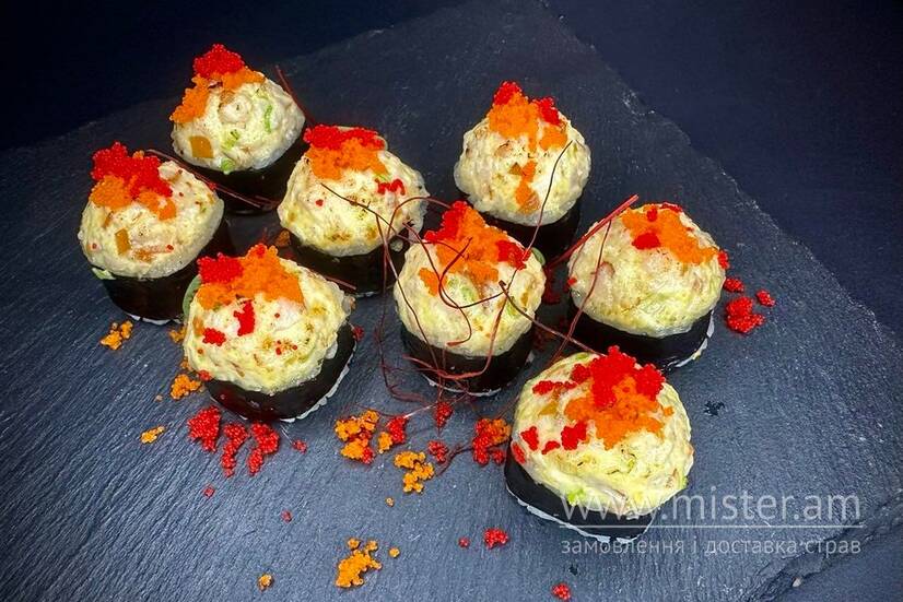 Норі, рис, вершковий крем-сир, курча копчене, огірок, соус спайсі, цибуля зелена. До ролів додаються палички, соєвий соус, імбир та васабі. З детальною інформацією про продукцію та вміст алергенів у конкретних стравах можна дізнатися за номером телефону закладу або за посиланням https://usnd.to/JOxl