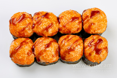 Норі, рис, лосось, огірок, ікра мсаго, соус спайсі, соус унагі. До ролів додаються палички, соєвий соус, імбир та васабі. З детальною інформацією про продукцію та вміст алергенів у конкретних стравах можна дізнатися за номером телефону закладу або за посиланням https://usnd.to/JOxl