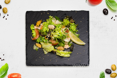Мікс салатів, креветки, мідії, помідори, соус соєвий, кунжут, маслини, лимон. З детальною інформацією про продукцію та вміст алергенів у конкретних стравах можна дізнатися за номером телефону закладу або за посиланням https://usnd.to/JOxl