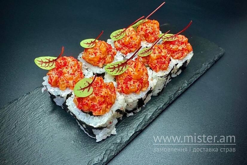 Норі, рис, вершковий крем-сир, огірок, лосось, соус спайсі, ікра масаго. До ролів додаються палички, соєвий соус, імбир та васабі. З детальною інформацією про продукцію та вміст алергенів у конкретних стравах можна дізнатися за номером телефону закладу або за посиланням https://usnd.to/JOxl