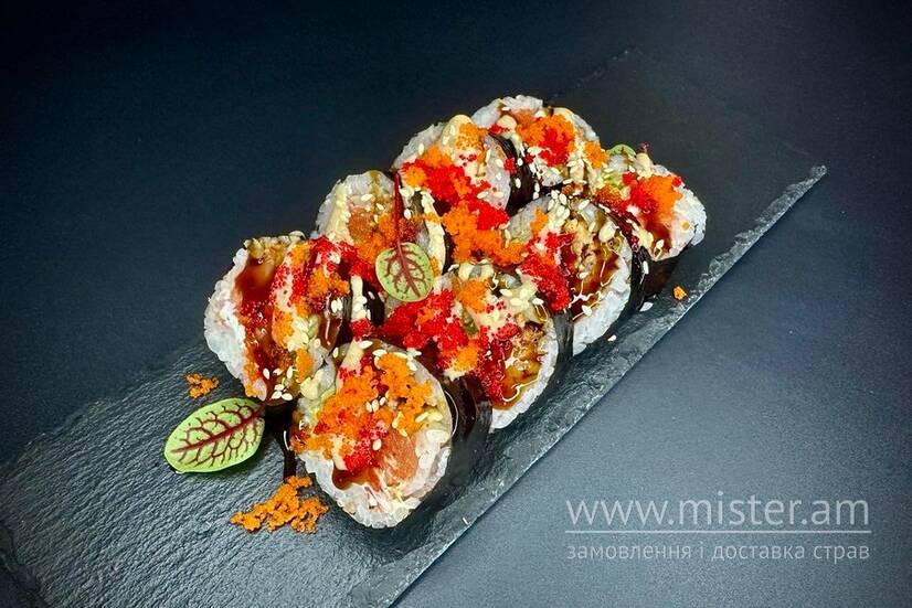 Лосось, вугор, сир Філадельфія, огірок, соус унагі, соус горіховий.