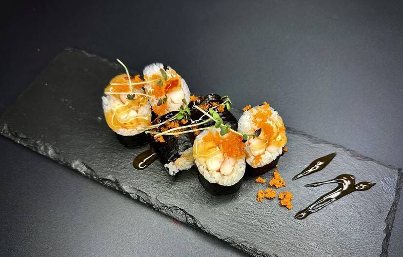 Норі, рис, смажена креветка, соус спайсі. До ролів додаються палички, соєвий соус, імбир та васабі. З детальною інформацією про продукцію та вміст алергенів у конкретних стравах можна дізнатися за номером телефону закладу або за посиланням https://usnd.to/JOxl