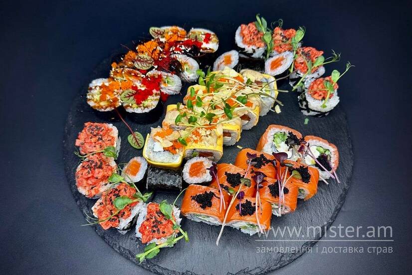 Макі з лососем, Фелікс з лососем, Філадельфія з лососем, Сирний рол з лососем, Футомакі з лососем теріякі. До ролів додаються палички, соєвий соус, імбир та васабі. З детальною інформацією про продукцію та вміст алергенів у конкретних стравах можна дізнатися за номером телефону закладу або за посиланням https://usnd.to/JOxl