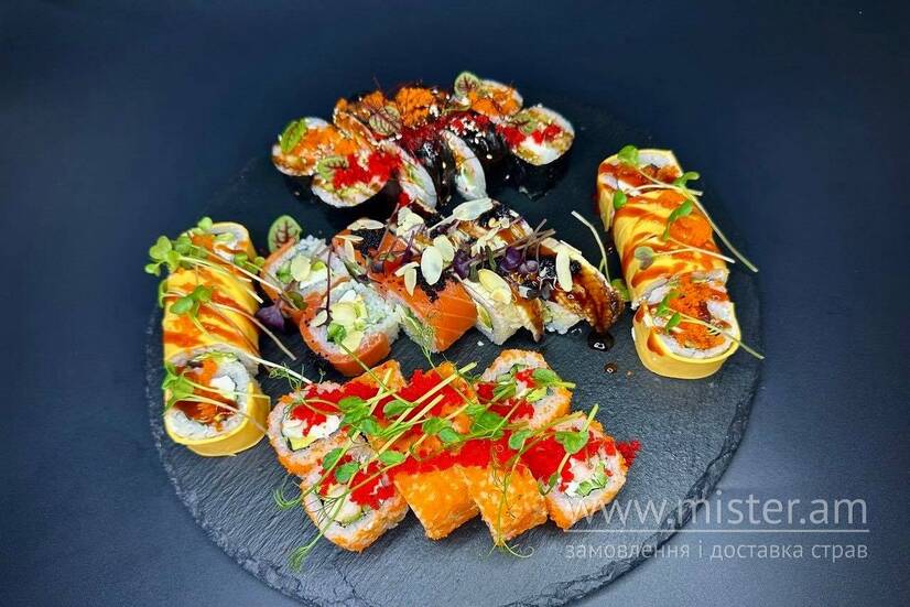 Філадельфія мікс лосось/вугор, Сирний рол з лососем, футомакі з лососем теріякі, Філадельфія з креветкою. До ролів додаються палички, соєвий соус, імбир та васабі. З детальною інформацією про продукцію та вміст алергенів у конкретних стравах можна дізнатися за номером телефону закладу або за посиланням https://usnd.to/JOxl
