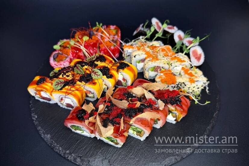 Філадельфія з тунцем в кунжуті, Каліфорнія з тунцем, сирний рол з тунцем, макі рол з тунцем, Філадельфія хіяші з тунцем. До ролів додаються палички, соєвий соус, імбир та васабі. З детальною інформацією про продукцію та вміст алергенів у конкретних стравах можна дізнатися за номером телефону закладу або за посиланням https://usnd.to/JOxl