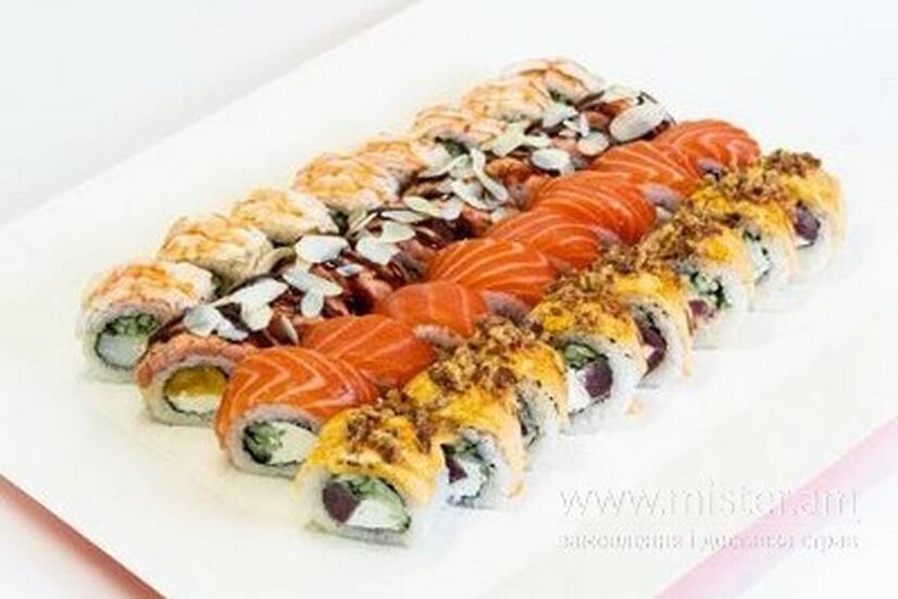 Рол Філадельфія з лососем, рол Філадельфія з креветкою, рол Філадельфія гриль, рол Філадельфія спайсі тунець.