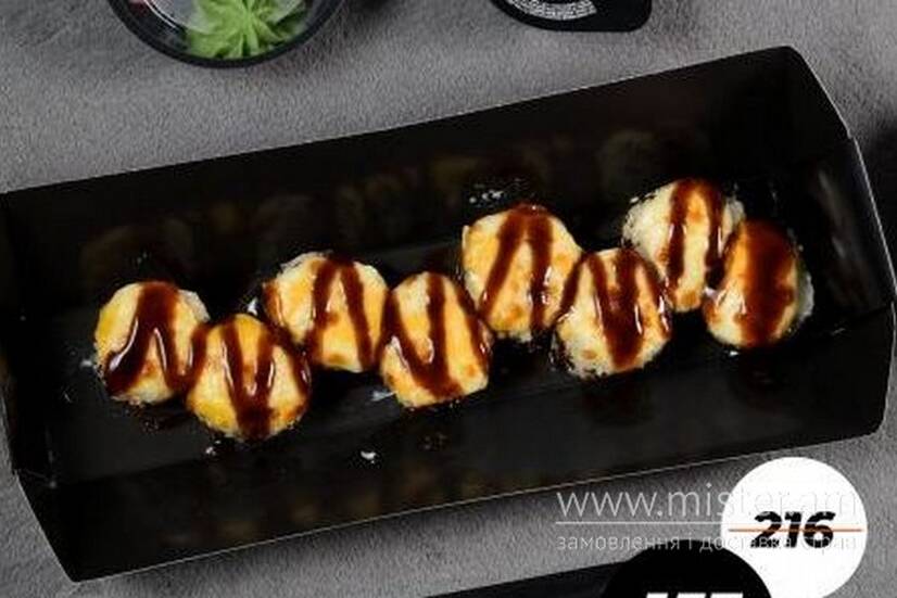 Рис, норі, крем-сир, вугор, японський омлет, кунжут, майонез, сир Пармезан, соус Унагі.